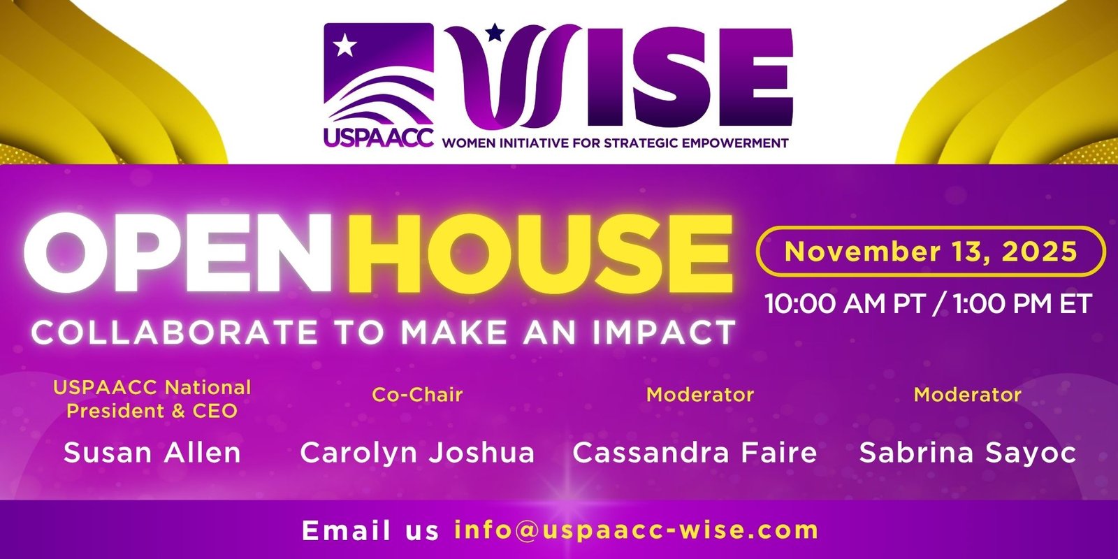 We’re excited to invite you to the USPAACC-WISE Open House on November 13th at 1 PM ET | 10 AM PT — an interactive conversation about the WISE programs, including the WISE Academy, Mentoring Circle, and Leadership Talks. This isn’t just an info session — it’s a chance for you to share your thoughts, ideas, and experiences as we continue to grow programs that empower entrepreneurs in business and leadership.